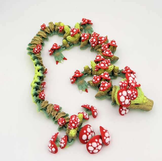 Elke Adult Mushroom Draak wordt vervaardigd met hoogwaardige glittergroene filamenten en verfijnde oranje details, waardoor elk exemplaar uniek is. De exacte kleurverdeling kan licht variëren, wat bijdraagt aan het fantasierijke en exclusieve karakter van deze prachtige draak.
